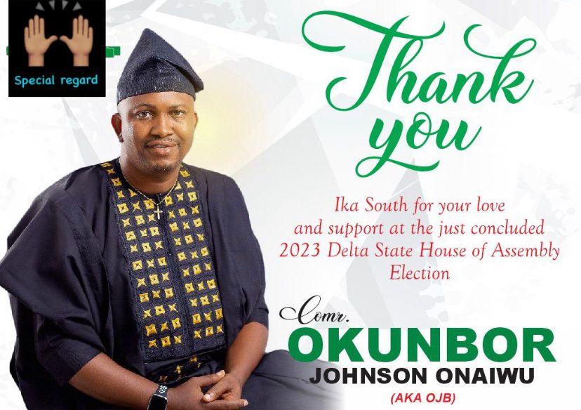 Although the Okunbor (OJ Best) for House of Assembly Campaign team did not expect the elections proper to end this way. It is what it is, we will continue to forge ahead, hoping for the expected outcome. we must continue to hope for a better Ika South, Delta, and Nigeria of our dreams where the ideals of justice, righteousness, and truth will be upheld. As I express my gratitude at this time, I call upon everyone to continue to pray for the future of Ika South, Delta, and Nigeria as we press on toward establishing a state and country where our aspirations can be fulfilled.
